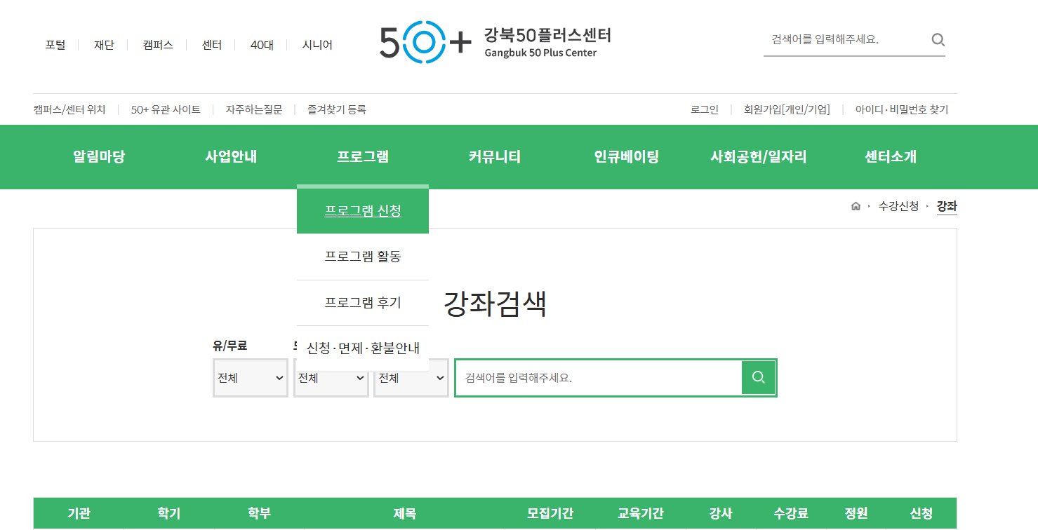 2. 강북50플러스센터 홈페이지 수강신청 방법