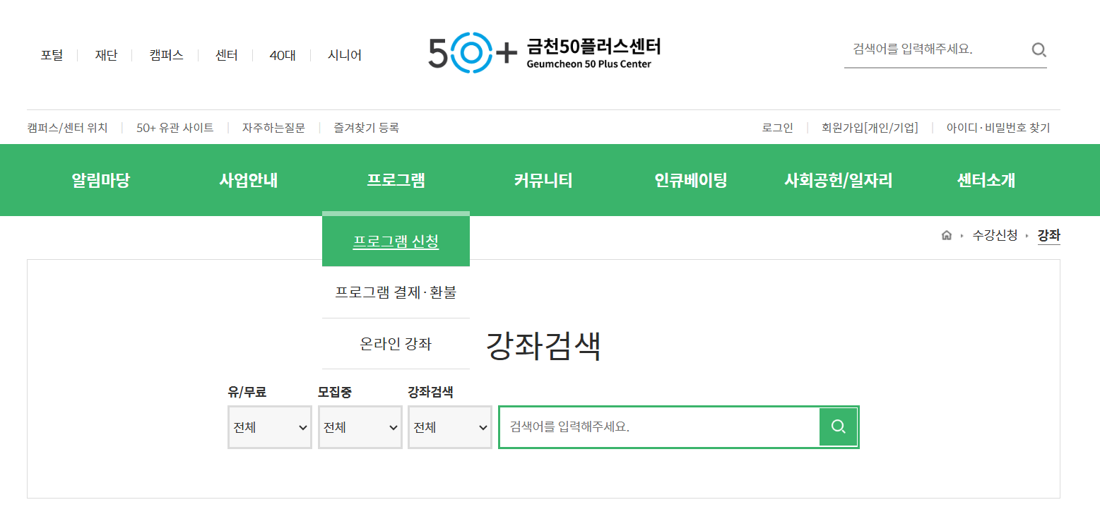 2. 금천50플러스센터 홈페이지 수강신청 방법