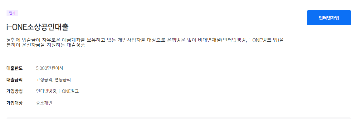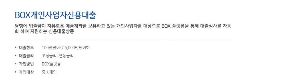 개인사업자라면 신청 가능한 대출입니다. 영업점에 방문해서만 신청 가능하고 신용등급에 따라서 한도 및 금리가 달라질 수 있습니다.