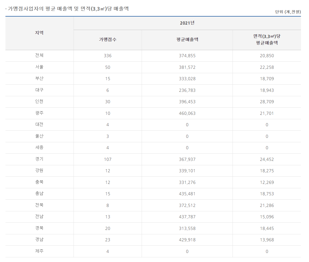 공정거래위원회의 정보공개서를 보면 22년 기준 평균 월 매출액 3,123만원, 일 매출액 104만원 입니다. 굉장히 매출이 잘 나오는 편입니다.