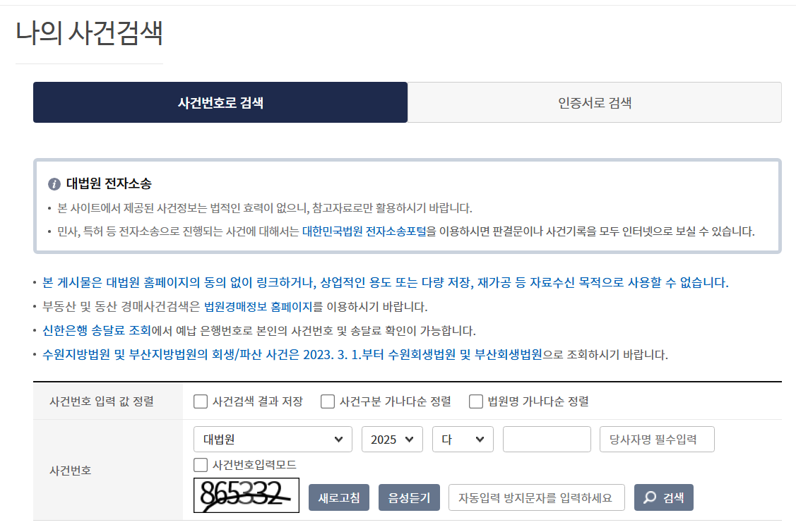 - 조회 방법 선택 (사건번호 / 당사자명)
