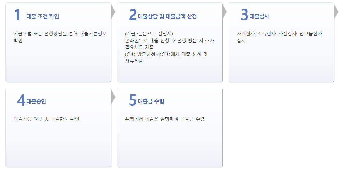 | 대출한도 | 일반 2.5억원(생애최초 일반 3억원) 신혼가구 및 2자녀 이상 가구 4억원 이내 (LTV 70%, 생애최초 주택구입자는 LTV 80%, DTI 60%이내) |