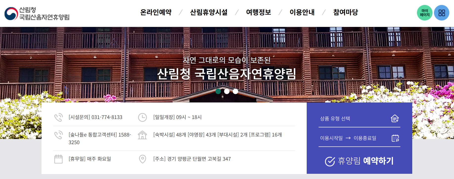 양평 국립 산음 자연휴양림의 예약은 산림청 통합 예약 시스템 **‘숲나들e’**를 통해 진행됩니다.