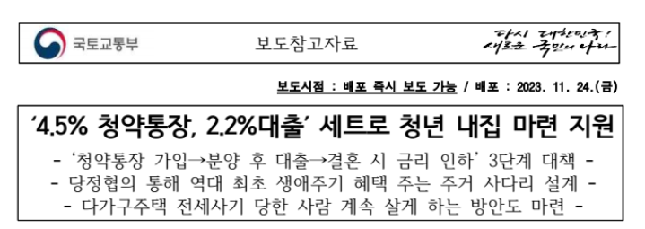 2023년 11월 24일에 보도된 청년 내집 마련 지원 정책입니다.