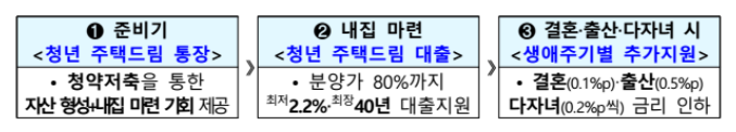 청년층의 자산 형성과 내집 마련을 지원하기 위해 1년간 청약 통장에 가입하면 2%대의 저리 대출을 생애 3단계에 걸처 추가 우대하는 획기적인 「청년 내집 마련 1·2·3」 주거지원을 추진한다고 합니다.