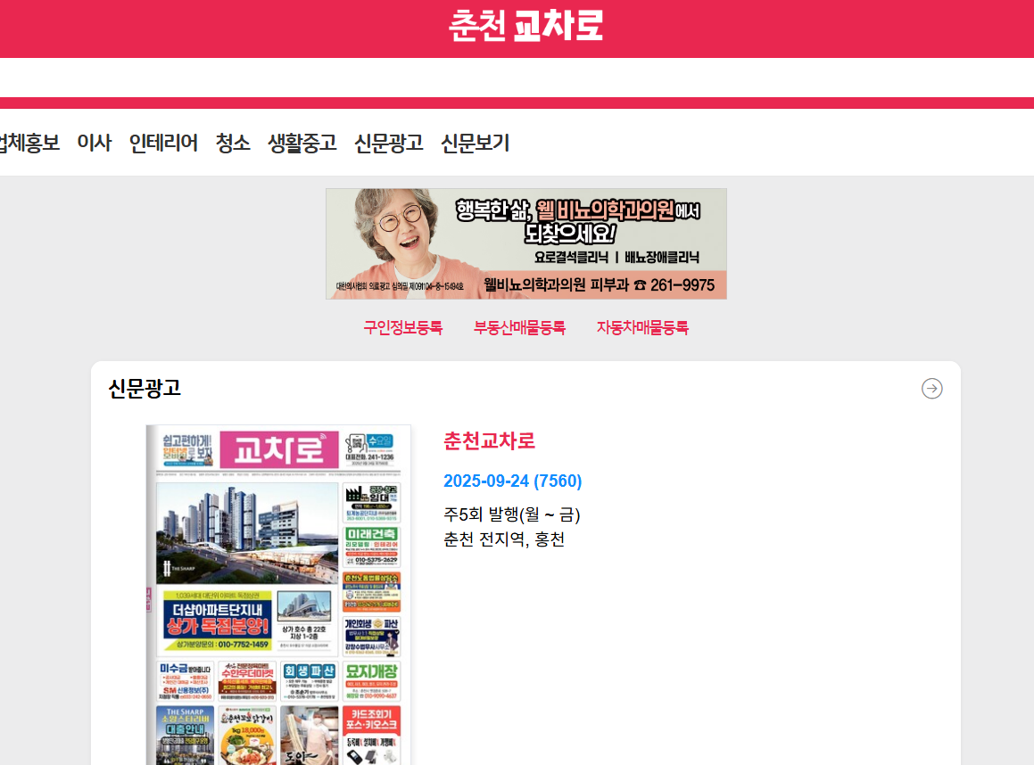 춘천교차로 신문은 춘천 시민들에게 꼭 필요한 생활 밀착형 정보지를 온라인에서도 그대로 확인할 수 있는 플랫폼입니다. 구인구직, 부동산, 자동차, 생활광고까지 한눈에 볼 수 있으며, 특히 ‘신문 그대로보기’ 기능으로 종이신문의 지면을 그대로 열람할 수 있다는 점이 큰 장점입니다.