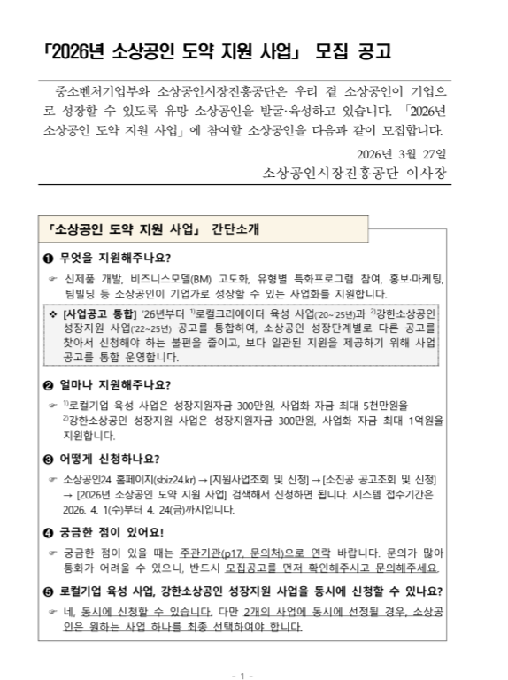 2026 소상공인 도약 지원사업은 유망 소상공인을 발굴해 기업으로 성장할 수 있도록 돕는 사업입니다. 중소벤처기업부와 소상공인시장진흥공단이 추진하며, 공고문상 사업명은 로컬기업육성과 강한소상공인 성장지원을 포함한 형태로 안내됩니다. 쉽게 말해 단순 생계형 지원보다 성장 가능성이 있는 소상공인의 상품 고도화와 시장 확장을 지원하는 사업에 가깝습니다. 2026년 소상공인 정책 방향도 혁신 성장과 재도약을 핵심 목표로 제시하고 있어, 이번 사업 역시 성장형 지원에 초점이 맞춰져 있다고 볼 수 있습니다.
