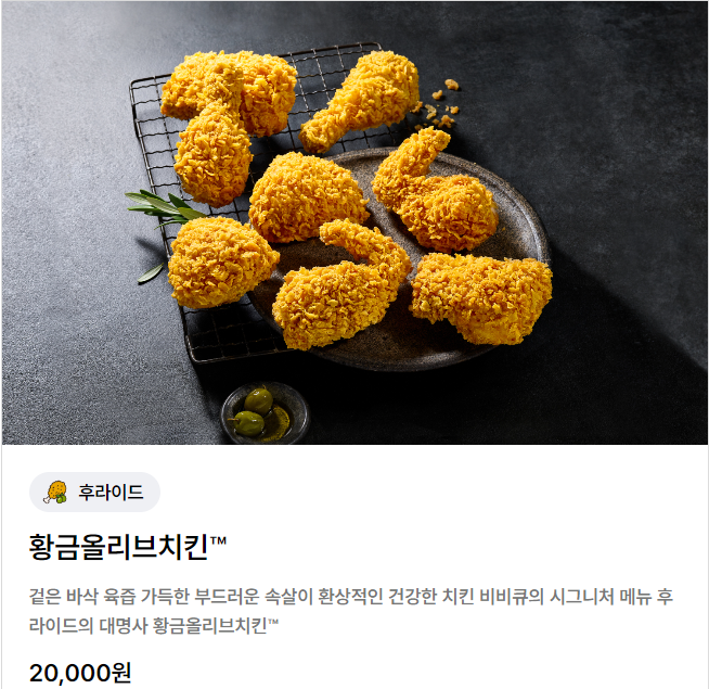 기본 메뉴인 황금 올리브 치킨으로 모든 사람들의 입맛을 사로잡은 브랜드 입니다.