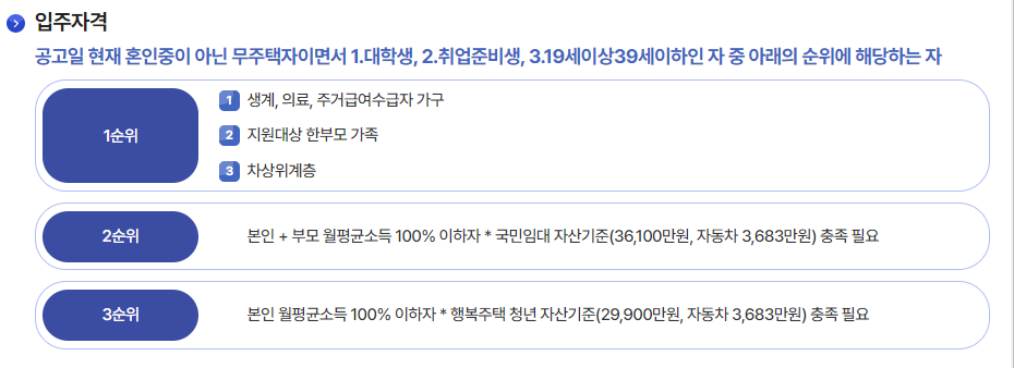 - 1,2,3순위 : 해당 세대의 소득이 전년도 도시근로자 가구당 월평균 소득 100% 이하(배우자 소득이 있는 경우 120% 이하) 충족, 행복주택(신혼부부) 자산기준 충족